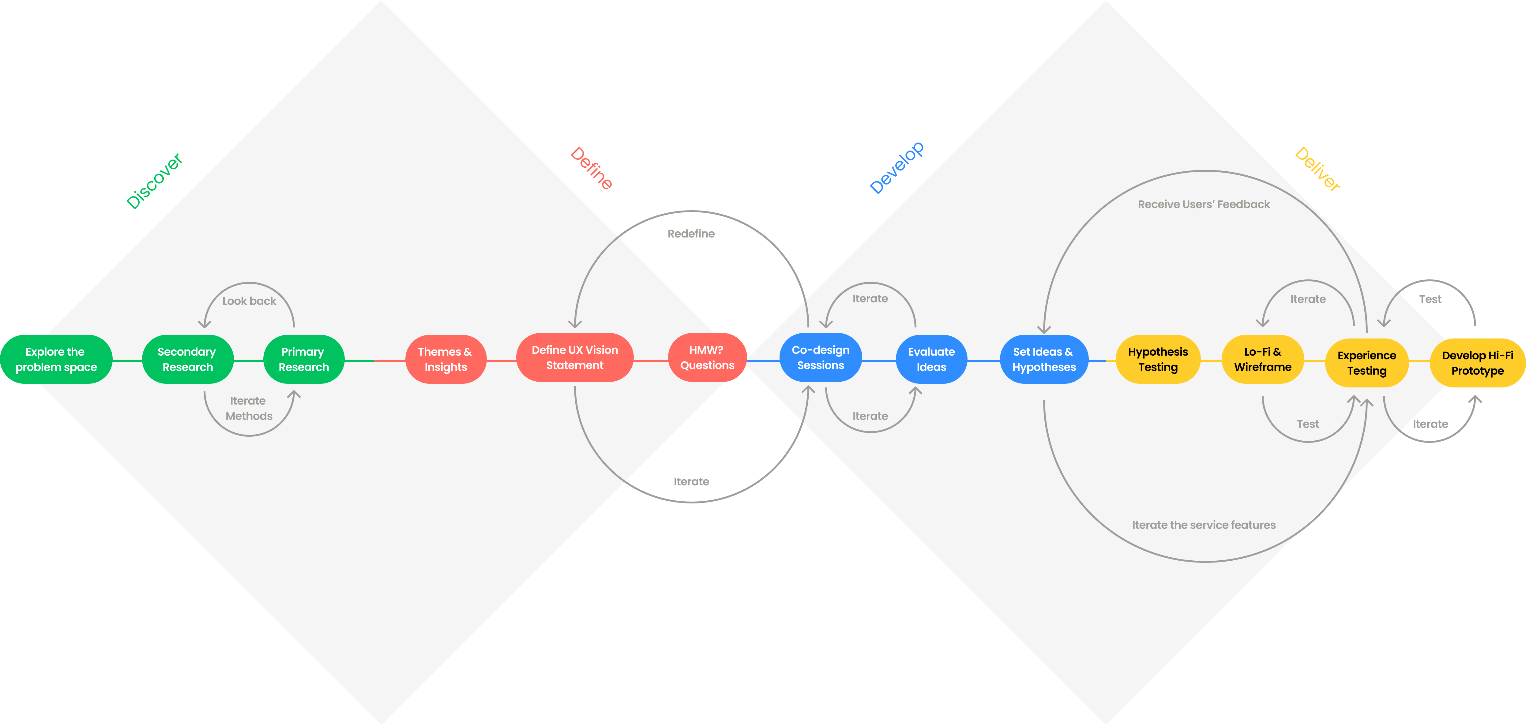 My user-centred process, grounded in Design Thinking and the Double Diamond approach, encompasses four phases: Discover, Define, Develop, and Deliver. Employing the non-linear nature of the Double Diamond, I conducted iterative testing throughout the process, ensuring my solutions effectively addressed user needs. This resulted in meaningful andeffective solutions that were validated through user feedback.