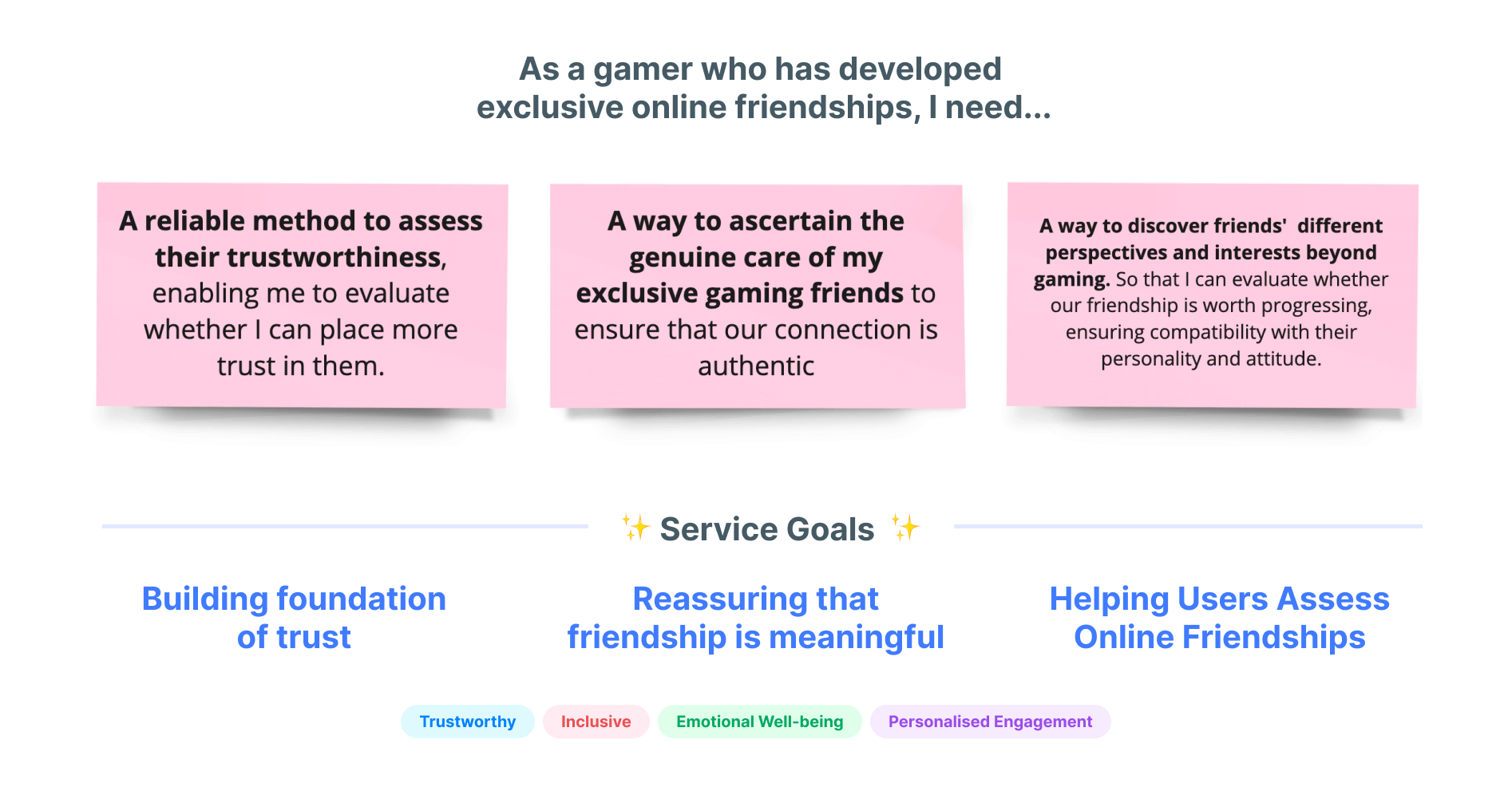 Leveraging user research data and Affinity Diagramming, I identified recurring themes and pain points related to trust in online gaming. These insights, validated through secondary research and aligned with trust-building theories, empowered me to address user challenges and inform design decisions, ultimately leading to impactful solutions.